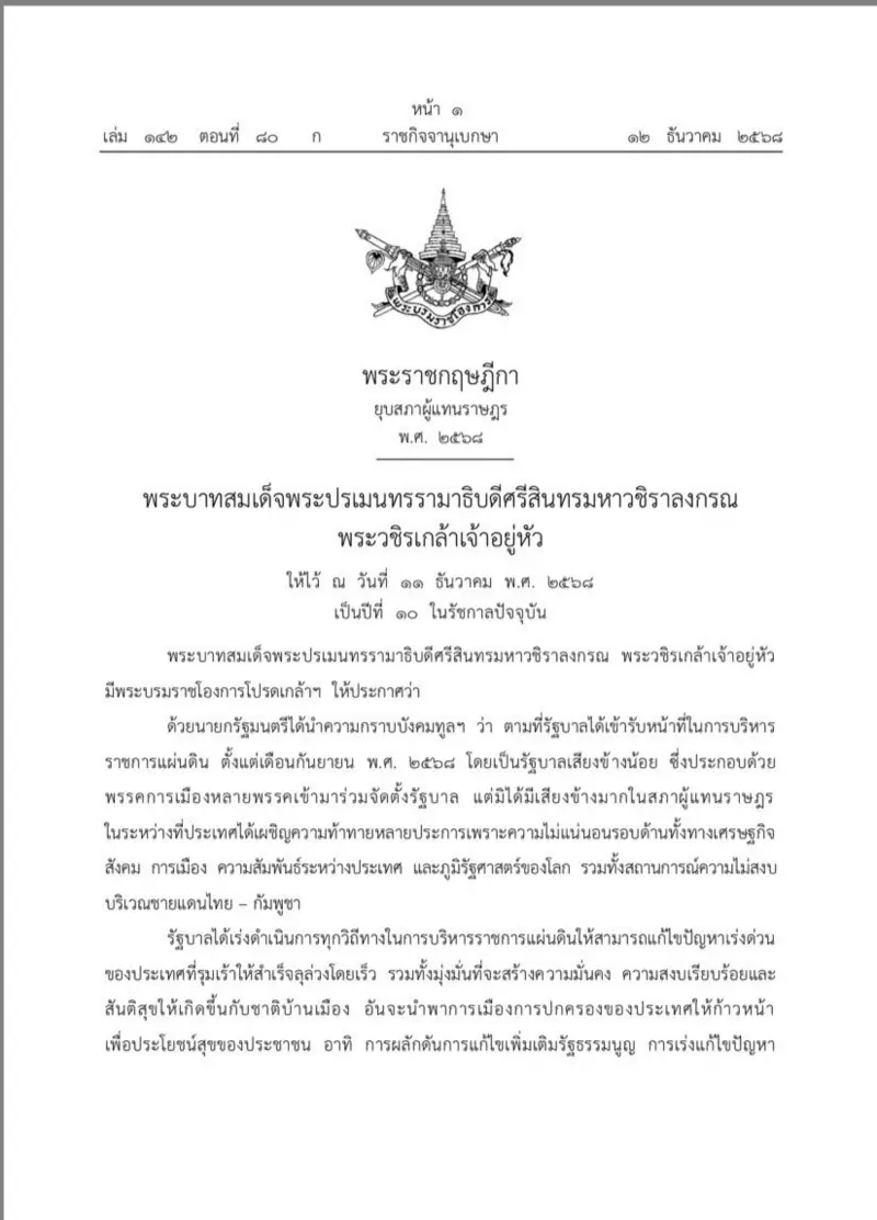 ด้วยนายกรัฐมนตรีได้นำความกราบบังคมทูลฯ ว่า ตามที่รัฐบาลได้เข้ารับหน้าที่ในการบริหารราชการแผ่นดิน ตั้งแต่เดือน ก.ย. 2568 โดยเป็นรัฐบาลเสียงข้างน้อย ซึ่งประกอบด้วยพรรคการเมืองหลายพรรคเข้ามาร่วมจัดตั้งรัฐบาล แต่มิได้มีเสียงข้างมากในสภาผู้แทนราษฎร
